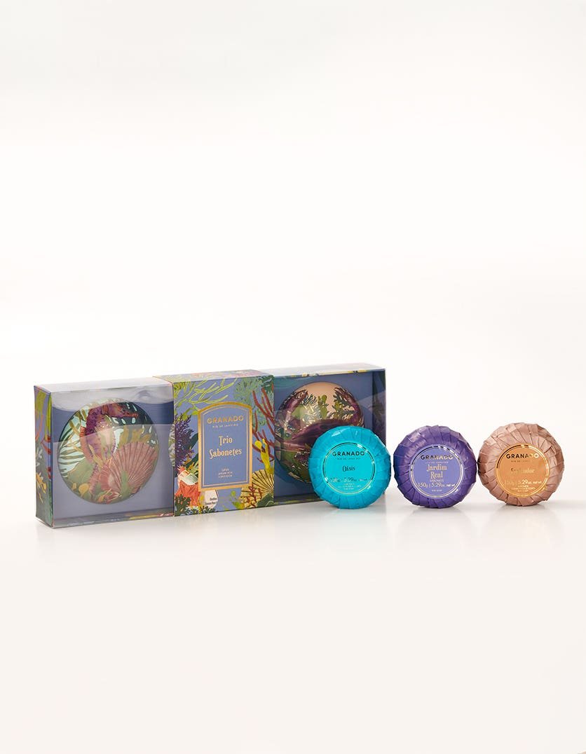 O kit Trio Sabonetes apresenta três sabonetes em barra nas fragrâncias Oásis, Jardim Real e Esplendor. Além disso, acompanha três bolas de Natal estampadas para decorar sua árvore de Natal!