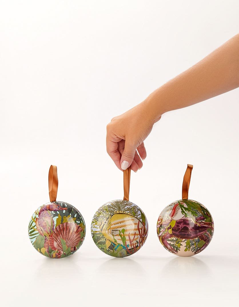 Na embalagem, as bolas de Natal seguem a identidade visual da coleção Fundo do Mar, que foi utilizada a técnica de colagem Vintage juntamente com ilustrações digitais. A caixa possui uma diversidade de espécies marinhas, unindo o frescor do mar e o calor tropical.