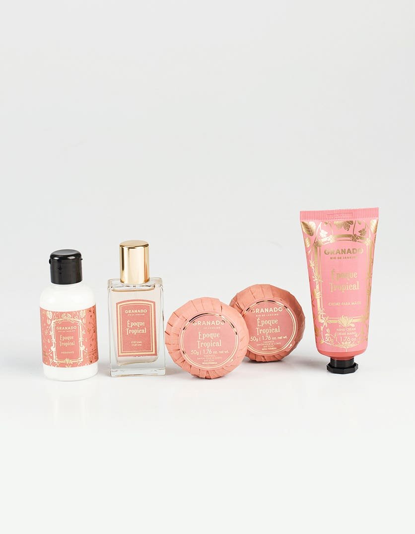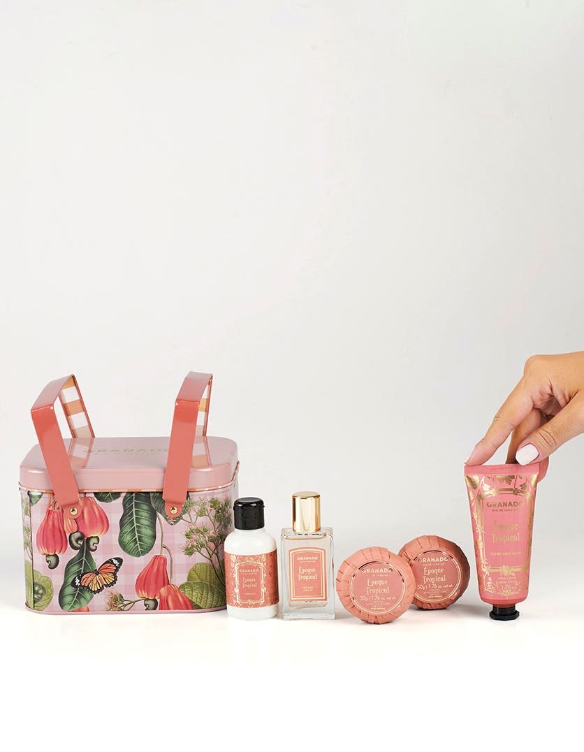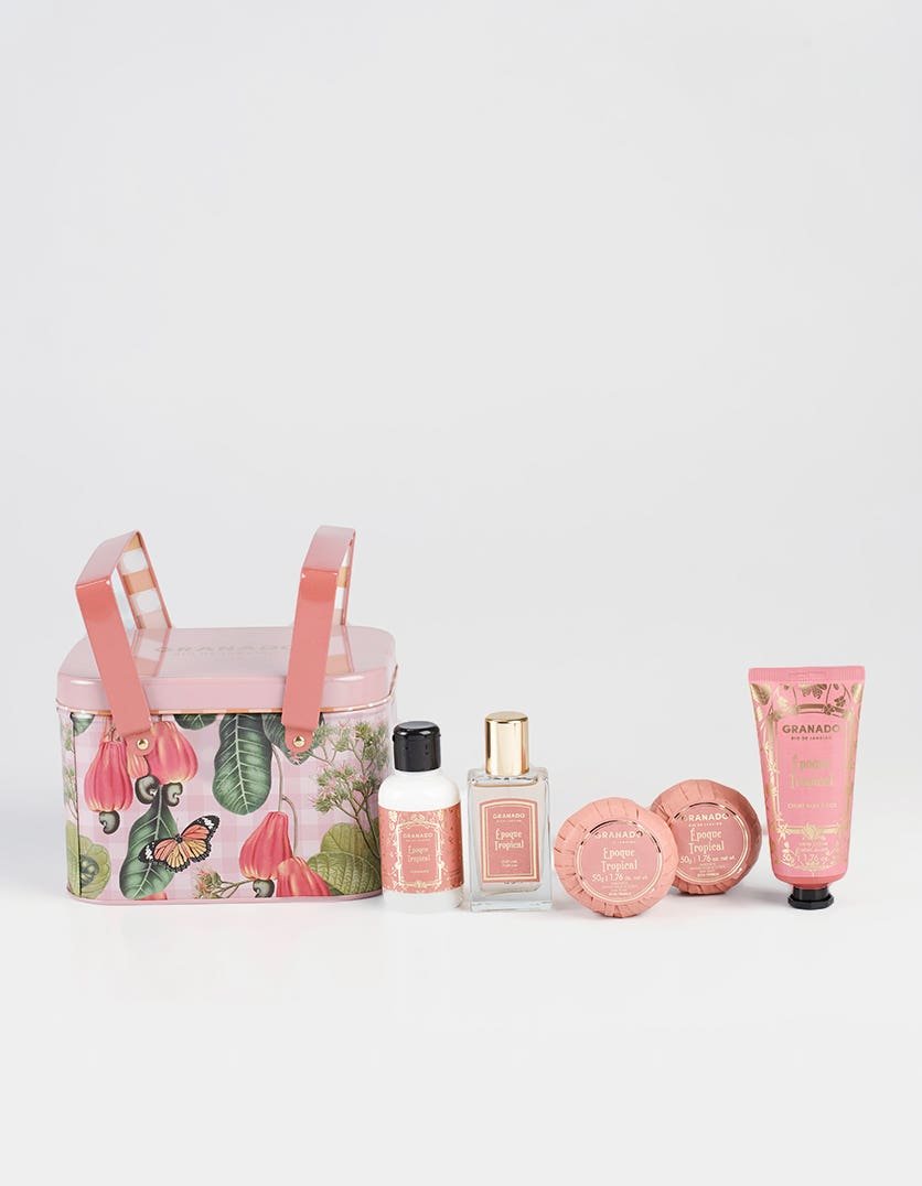 O Kit Cesta Picnic Époque Tropical vem em uma lata com formato inspirado nas cestas de piquenique e contém os itens essenciais da perfumaria. É um verdadeiro convite a experimentação da fragrância com um perfume, um hidratante, dois sabonetes em barra e um creme mãos.