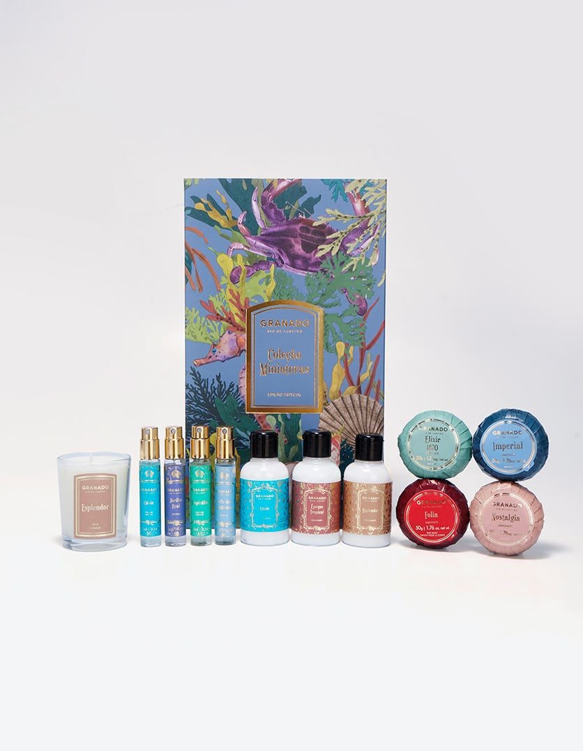 Conteúdo: 1 vela Esplendor 80g, 1 perfume Jardim Real 10ml, 1 perfume Infusão Botânica 10ml, 1 perfume Oásis 10ml, 1 perfume Tropicália 10ml, 1 sabonete barra Imperial 50g, 1 sabonete barra Nostalgia 50g, 1 sabonete barra Elixir 1870 50g, 1 sabonete barra Folia 50g, 1 hidratante Oásis 60ml, 1 hidratante Époque Tropical 60ml, 1 hidratante Esplendor 60ml.