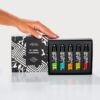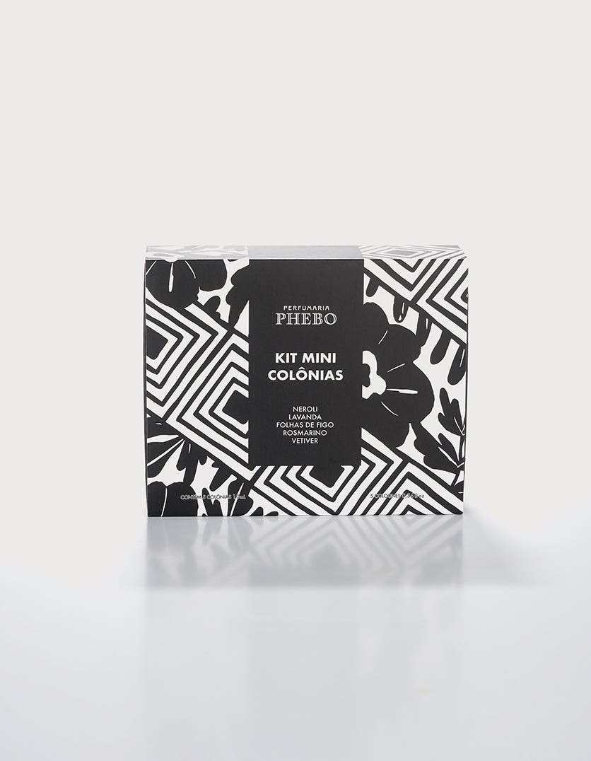 A caixa que acompanha as minicolônias segue a identidade visual da coleção especial da Natal de Águas de Phebo. As cores vibrantes que representam cada fragrância foram mantidas nos detalhes das embalagens dos produtos e se destacam sobre as cores neutras do preto e branco.