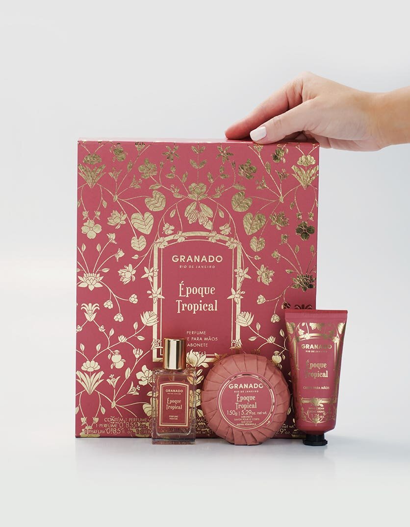 Ele tem um perfume em miniatura, um creme para mãos e um sabonete em barra cremoso da fragrância Époque Tropical, ideais para serem reaplicados sempre que quiser.