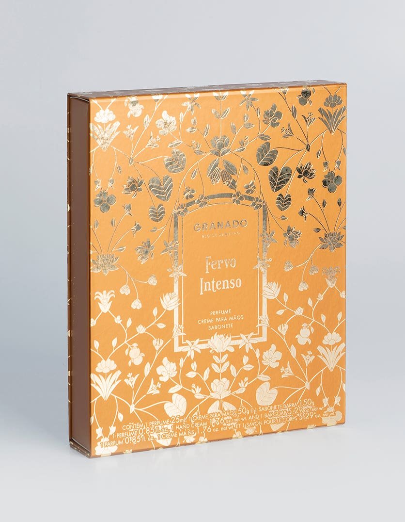 Os produtos acompanham uma caixa ilustrada com a estampa de Fervo Intenso, podendo ser usada como uma caixa organizadora, além de ser um presente ideal para quem ama se perfumar. A embalagem segue o pantone metalizado de Fervo Intenso e a estampa em hot stamping.